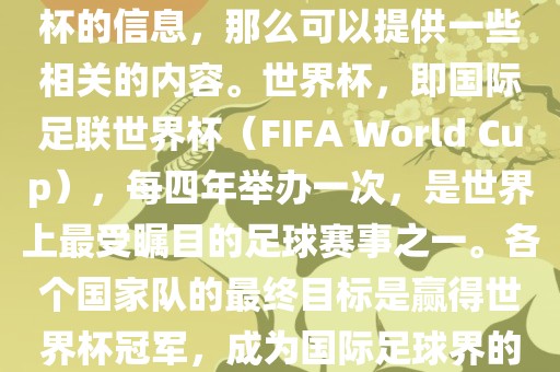 世界杯是国际足联主办的一项足球赛事,每四年举办一次,是全球最受欢迎的体育赛事之一。各国足球队争夺世界杯冠军的荣誉,旨在成为国际足球领域的佼佼者。赢得世界杯冠军是每个国家队的最终目标,也是足球迷们翘首以盼的盛事。