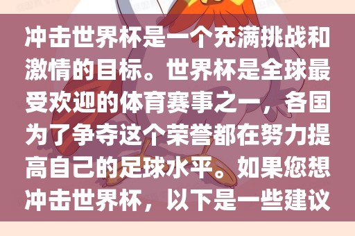 冲击世界杯是一个充满挑战和激情的目标。世界杯是全球最受欢迎的体育赛事之一,各国为了争夺这个荣誉都在努力提高自己的足球水平。如果您想冲击世界杯,以下是一些建议