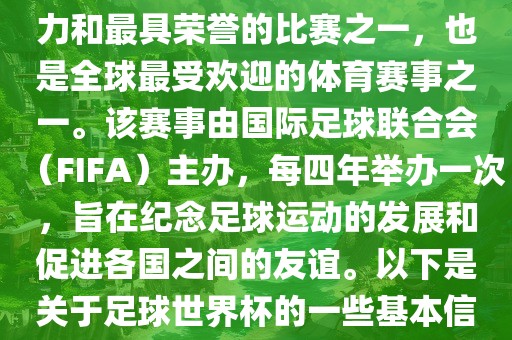足球世界杯是由国际足球联合会(FIFA)主办的全球最受欢迎的体育赛事之一,每四年举办一次。该赛事旨在纪念足球运动的发展和促进各国之间的友谊。作为足球界最具影响力和最具荣誉的比赛之一,足球世界杯吸引了全球无数球迷的关注。