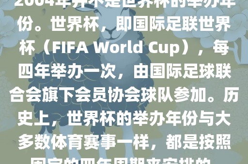 2004年并不是世界杯的举办年份。世界杯,即国际足联世界杯(FIFA World Cup),每四年举办一次,由国际足球联合会旗下会员协会球队参加。历史上,世界杯的举办年份与大多数体育赛事一样,都是按照固定的四年周期来安排的。