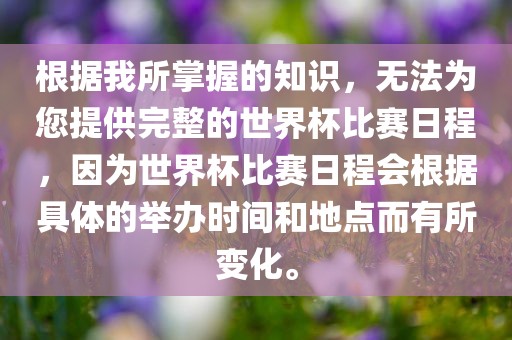建议您通过官方渠道或相关新闻获取最新的世界杯比赛日程,您可以关注国际足联(FIFA)的官方网站、社交媒体账号或相关体育新闻网站,以获取最准确和最新的世界杯比赛日程信息。