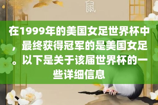 在1999年的美国女足世界杯中,最终获得冠军的是美国女足。以下是关于该届世界杯的一些详细信息
