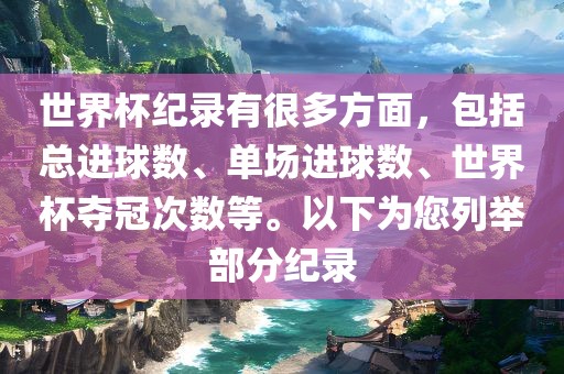 世界杯纪录有很多方面,包括总进球数、单场进球数、世界杯夺冠次数等。以下为您列举部分纪录