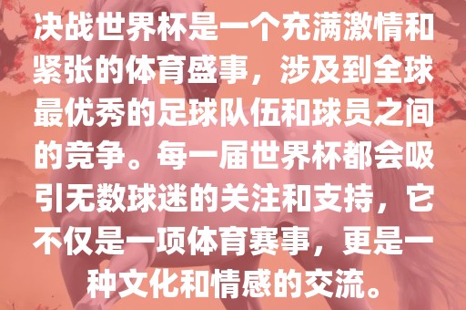 决战世界杯是一个充满激情和紧张的体育盛事,涉及到全球最优秀的足球队伍和球员之间的竞争。每一届世界杯都会吸引无数球迷的关注和支持,它不仅是一项体育赛事,更是一种文化和情感的交流。
