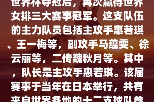 在2011年日本女排世界杯赛中,中国女排以全胜战绩摘得冠军,这也是中国女排继1995年世界杯夺冠后,再次赢得世界女排三大赛事冠军。这支队伍的主力队员包括主攻手惠若琪、王一梅等,副攻手马蕴雯、徐云丽等,二传魏秋月等。其中,队长是主攻手惠若琪。该届赛事于当年在日本举行,共有来自世界各地的十二支球队参与角逐。此外,该届世界杯的最佳发球奖由日本名将木村纱织获得。