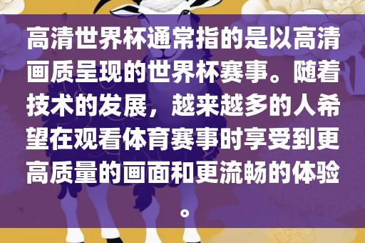 高清世界杯通常指的是以高清画质呈现的世界杯赛事。随着技术的发展,越来越多的人希望在观看体育赛事时享受到更高质量的画面和更流畅的体验。