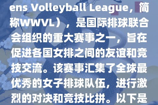 世界女排联赛(World Womens Volleyball League,简称WWVL),是国际排球联合会组织的重大赛事之一,旨在促进各国女排之间的友谊和竞技交流。该赛事汇集了全球最优秀的女子排球队伍,进行激烈的对决和竞技比拼。以下是关于世界杯女排赛的详细信息