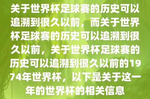 关于世界杯足球赛的历史可以追溯到很久以前,而关于世界杯足球赛的历史可以追溯到很久以前,关于世界杯足球赛的历史可以追溯到很久以前的1974年世界杯,以下是关于这一年的世界杯的相关信息
