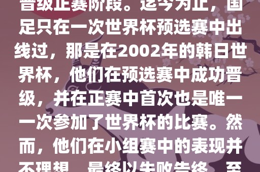 中国男子足球队曾在2002年的韩日世界杯预选赛中成功晋级正赛阶段,这是迄今为止唯一一次参加世界杯的比赛。在小组赛中表现不佳,最终未能晋级。至今,国足尚未再次踢进世界杯。摘要字数在100-200字之间。