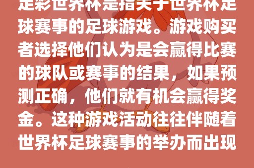 摘要:足彩世界杯是一种基于世界杯足球赛事的足球游戏,玩家通过预测比赛结果来参与游戏,有机会赢得奖金。这种游戏活动通常伴随着世界杯足球赛事的举办而出现,玩家可以选择他们认为会获胜的球队或赛事结果。